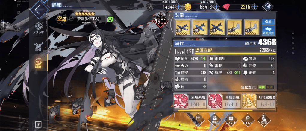 Lv120、スキル10なのでどこに出しても恥ずかしくありません。META飛龍と組ませたいですね。