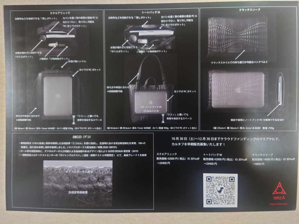 こちらは「トリプルエー株式会社(https://triplea.co.jp/)」がこれから販売しようとしている、軽くて丈夫な“DECO”という合成皮革素材で作られたカバンの展示をしていました。