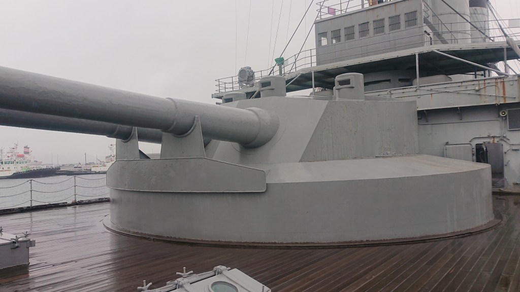 階段を登って受付を過ぎると、すぐに後部の主砲がお出迎えです。