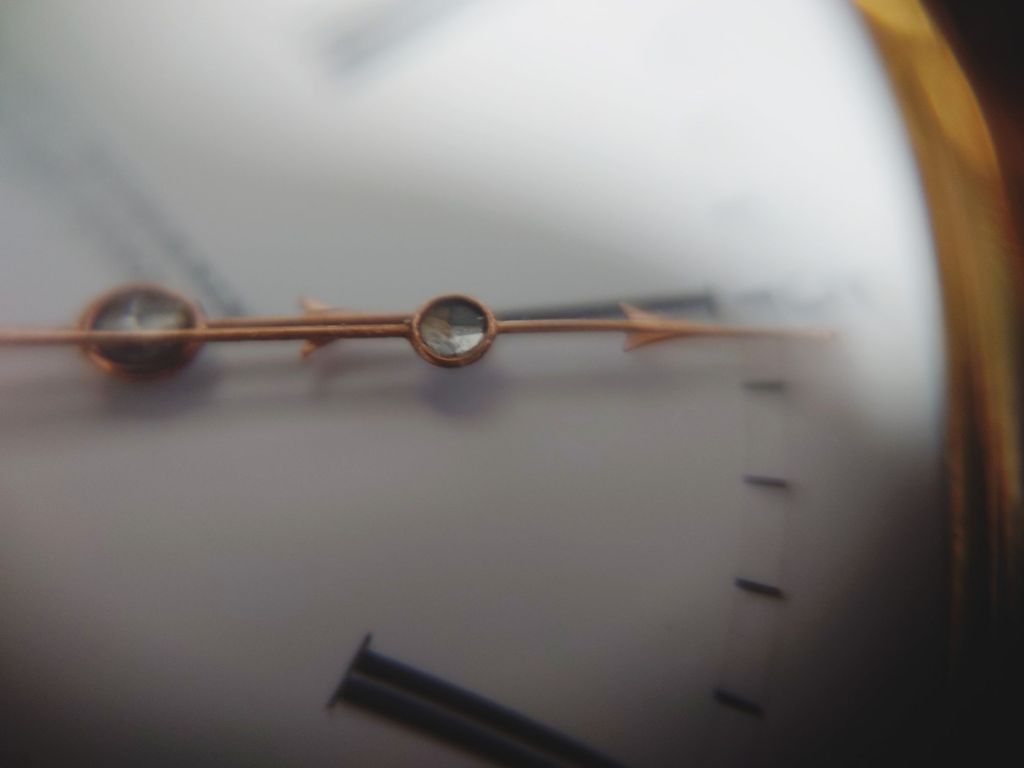 この時計の販売者曰く、この時計の針の形状は違うが1700/1800年代の時計でもダイヤ付きの針は何度か見たことがあるらしい。